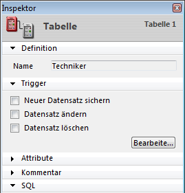 Einen Trigger für eine Tabelle erstellen Sie entweder über das Fenster Explorer, oder Sie klicken im Inspektorfenster auf die Schaltfläche Bearbeiten oder doppelklicken bei gedrückter alt-Taste unter Windows bzw. Wahltaste auf Macintosh auf den Tabellentitel im Strukturfenster. Weitere Informationen dazu finden Sie im Abschnitt Trigger des Handbuchs 4D Designmodus.