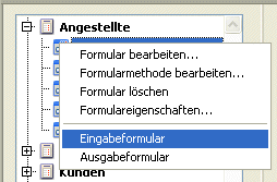 3. Klicken Sie mit der rechten Maustaste auf den entsprechenden Formularnamen und wählen Sie im Kontextmenü den Eintrag Eingabeformular oder Ausgabeformular: