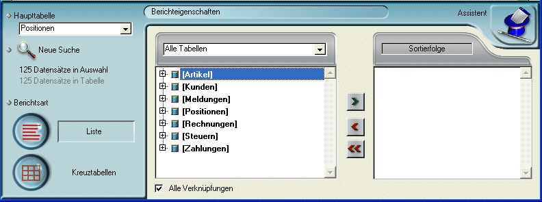 Datenteil des Schnellberichts: Hier definieren Sie die Berichtart und wählen die gewünschten Daten aus. Über das Icon in der rechten oberen Ecke können Sie auch den Berichtassistenten aufrufen: