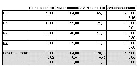 Beispiel: In einer Kreuztabelle können Sie anzeigen, wieviel von jeder Produktart pro Quartal verkauft wurden. Hierzu ein Beispiel:
