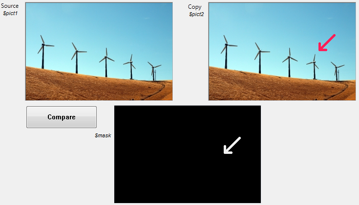 En el siguiente ejemplo, comparamos dos imágenes (pict1 y pict2) y mostramos la máscara resultante: