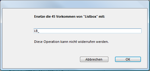 Wählen Sie diesen Befehl, erscheint ein Dialogfenster, wo Sie die Zeichenkette eingeben, die alle Vorkommen der ersten Suche ersetzen: