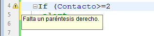 En el momento de la validación, 4D efectúa una verificación sintáxica a nivel de las líneas (sintaxis de los comandos) y/o de la estructura de las instrucciones (If, End if, etc.). 4D también verifica la correspondencia de los elementos de cierre del código tales como paréntesis o comillas. Cuando digita un carácter de cierre, 4D indica el correspondiente de estos elementos al enmarcar los caracteres de inicio/fin con rectángulos grises: