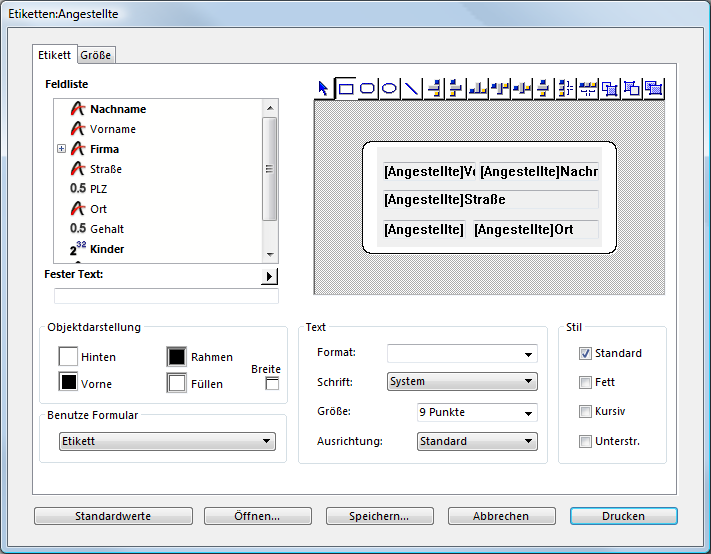 Um ein Listenformular als Etikett anzulegen und über den Etiketteneditor zu drucken: