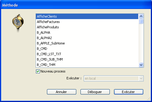 Toutefois, notamment à des fins de test et de débogage, 4D vous permet de déclencher manuellement l’exécution des méthodes projet et de certaines méthodes base depuis le mode Développement. Il est dans ce cas possible d’exécuter la méthode dans un nouveau process et/ou directement en mode Trace, afin de pouvoir contrôler son exécution au pas à pas