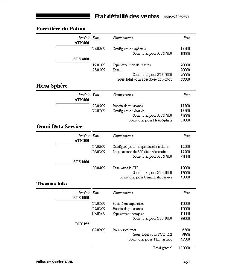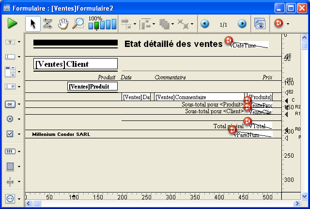 VenteProd:=Sous total([Produits]Prix)Le sous-total des ventes pour la zone de rupture de niveau 1 est calculé et placé dans un objet nommé VenteClient associé à la méthode suivante :