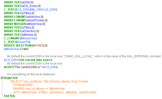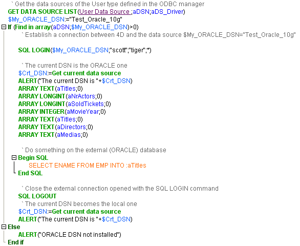 The example below shows how to connect to an external data source (ORACLE), how to get data from the ORACLE database, and then how to disconnect from the ORACLE database and return to the local database.