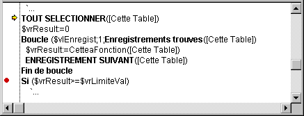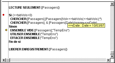 Vous pourriez aussi exécuter la boucle, mais si la table [CetteTable] contient plusieurs centaines d’enregistrements, cette opération vous prendra la journée. Pour éviter des situations de ce type, le débogueur met à votre disposition des points d’arrêt. Vous insérez des points d'arrêt en cliquant dans la marge gauche de la fenêtre d'évaluation des méthodes.