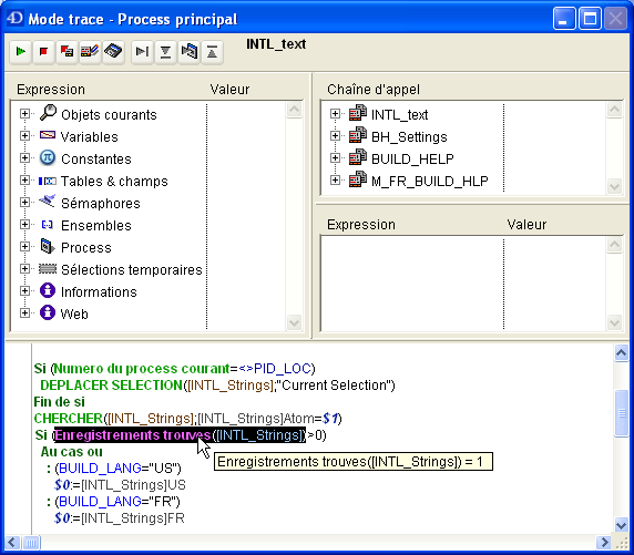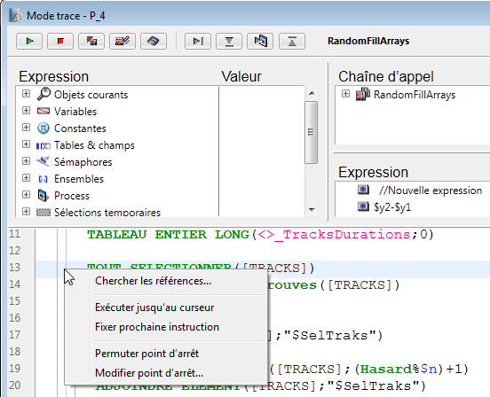 - Si vous appelez la commande TRACE quelque part, vous pouvez cliquer sur le bouton Pas de Trace pour reprendre l’exécution jusqu’à cet appel TRACE.