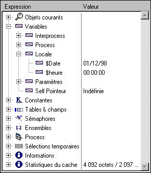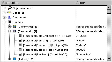 Ce thème affiche la liste des tables et des champs dans la base de données (à l’exception des sous-champs). Pour chaque table, la colonne Valeur affiche la taille de la sélection courante pour le process courant ainsi que (lorsque la ligne de la table est déployée) le nombre d'enregistrements verrouillés. Pour chaque champ, la colonne Valeur affiche la valeur du champ (à l’exception des images, sous-tables et BLOBs) pour l’enregistrement courant, s'il existe. Dans ce thème, les valeurs des champs peuvent être modifiées (notez qu'il n’y a alors pas d’annulation possible) mais pas celles de la table.