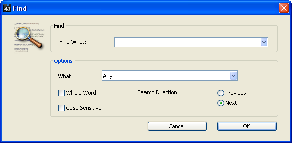 The “Find What:” area enables you to enter the string of characters to be searched for. This area is a combo box that stores the last 15 character strings that have been searched for or replaced during the session. If you highlight text before choosing the Find... command, it will appear in this area. You can then either use this text or replace it with another.