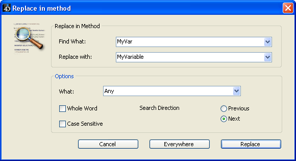 The Previous/Next radio buttons are used to set the direction of the search: towards the beginning or end of the current method, starting from the initial location of the cursor.