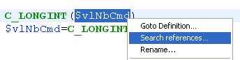 The Search references... command found in the Method menu or the context menu of the Method editor finds all the objects (methods and forms) in the database where the current item of the method is referenced (used).