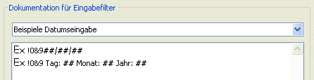 Die Bereiche Dokumentation für Eingabefilter/Anzeigeformate enthalten jeweils ein DropDown-Menü und einen Anzeigebereich. Hier können Sie ein Thema wählen, über das Sie Beispiele und Informationen erhalten möchten.