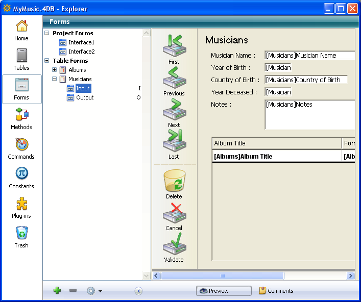 フォームを削除するには、リスト中で名前を選択し、削除ボタンをクリックするか、コンテキストメニューからフォーム削除コマンドを選択します。フォームエクスプローラーのをゴミ箱にドラッグ&ドロップすることもできます。