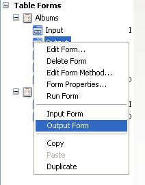 エクスプローラーを使用して、テーブルごとにカレントの詳細フォームと一覧フォームを指定できます (テーブルフォームのみ)。これを行うには、階層リスト中で指定するフォームを選択し、コンテキストメニューから入力フォームまたは出力フォームコマンドを選択します: