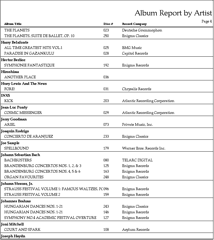 4DデータベースでCDの楽曲リストを管理しているとしましょう。このリストをアーチストごと印刷するとします。アーチストでレコードをソートすると、すべてのレコードはいずれかのアーティストグループに属します。ここでブレークは印刷される各グループの最後のレコードの後に発生します。画面上でレポートをプレビューした結果は以下の通りです: