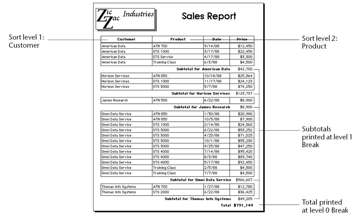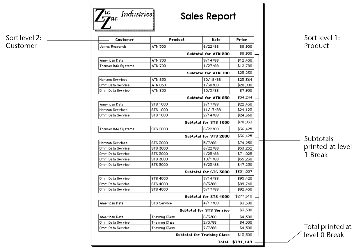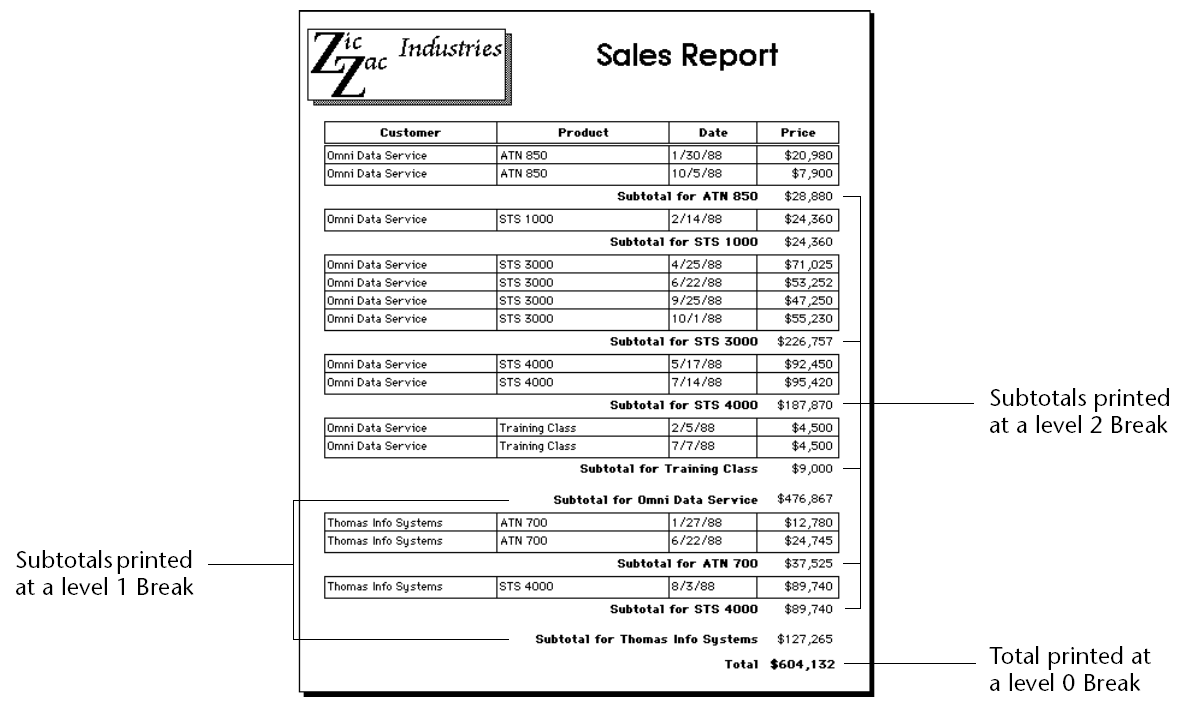 下の図は売り上げの記録を示していて、顧客/製品/営業担当でソートされています。サマリ計算では2セットの小計、各顧客ごとの小計と、さらに各顧客内で、製品ごとの小計が印刷されています。最後にこのレポートは会社全体の総計を印刷します。これはそれぞれレベル2ブレーク、レベル1ブレーク、そしてレベル0ブレークを実行する例題です。