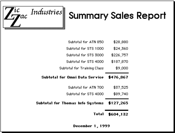 サマリ (概要) 情報だけを印刷するレポートを作成することもできます。このようなレポートでは小計と総計だけがそのタイトルとともに印刷されます。以下の図はサマリ情報のみを印刷するレポートです: