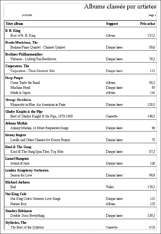 Imaginons que vous souhaitiez imprimer un état de votre collection de disques, classé par artistes. Vous disposez probablement de plusieurs disques du même artiste. Lorsque vous triez les enregistrements par artistes, vous obtenez alors des groupes d’enregistrements distincts. La “rupture” se produit après l’impression du dernier enregistrement de chaque groupe. Voici le type d’état que vous pouvez obtenir :