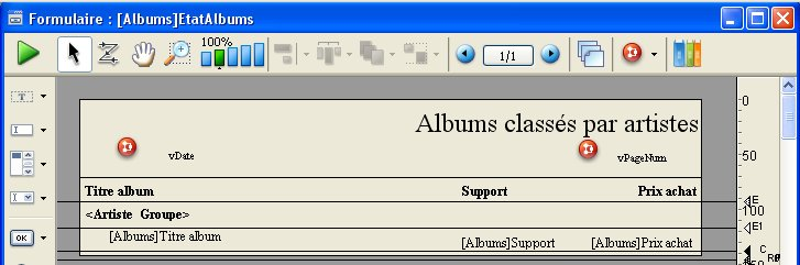 Les états imprimés, à la différence des formulaire liste écran, peuvent utiliser la zone de rupture située à la fin de l’état. Pour les éléments qui doivent apparaître à la fin de chaque page, les états imprimés utilisent la zone de pied de page.