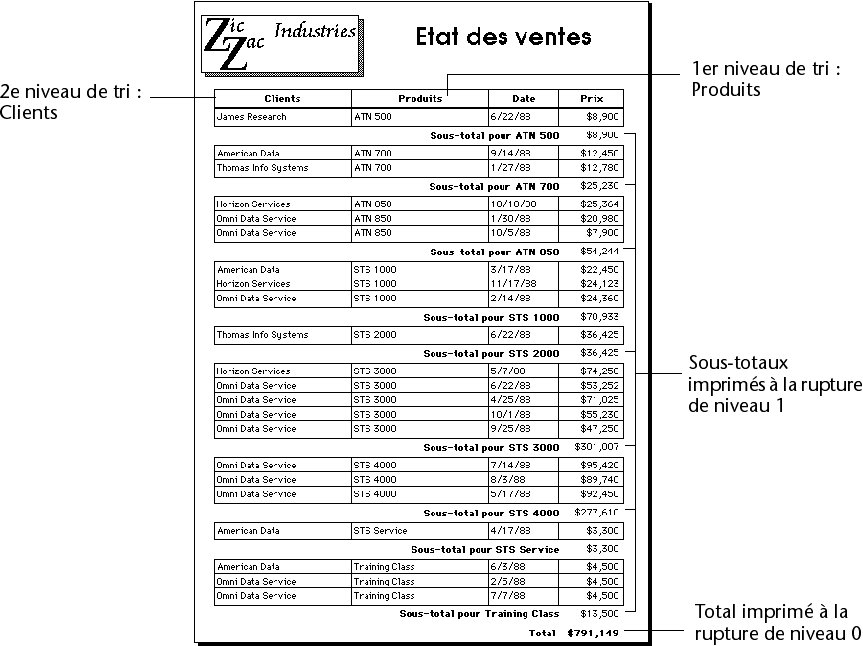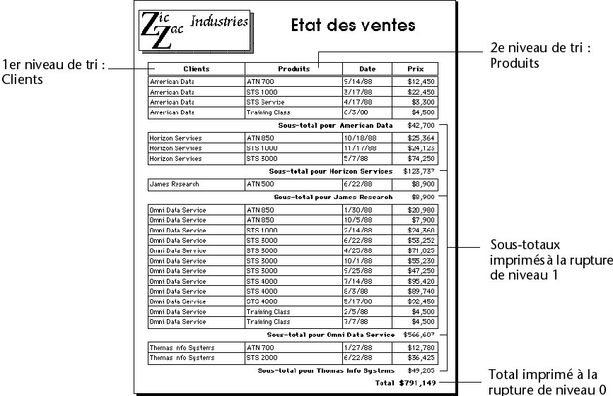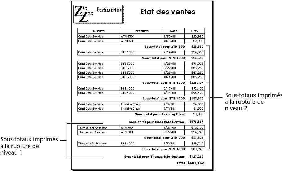 4D sait quand effectuer le calcul et imprimer le sous-total car il a reçu l’instruction de le faire à chaque changement de la valeur du premier champ trié (à chaque fois qu’il y a “rupture”). Le sous-total des clients est calculé dans ce qui est appelé la rupture de niveau 1 car il est basé sur le premier champ trié (dans ce cas, le champ Clients). Le total général est calculé dans la rupture de niveau 0. La rupture de niveau 0 inclut tous les enregistrements et est générée à la fin de l’état.
