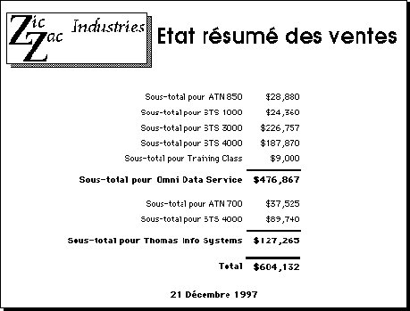 4D peut automatiquement calculer et imprimer des totaux et des sous-totaux. L’exemple ci-dessous montre un état qui calcule un sous-total pour chaque client et un total général final.