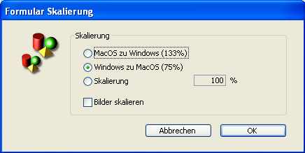 Um Unterschiede der Bildschirmauflösungen auszugleichen, müssen Sie Objekte neu skalieren. Im Menü Formular können Sie mit dem Befehl Skalieren die Größe aller Formularobjekte in einem Vorgang proportional ändern.