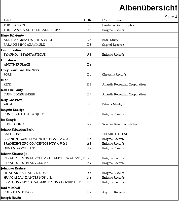 Nehmen wir an, Sie haben eine CD-Sammlung, die Sie mit einer 4D Anwendung verwalten und Sie möchten eine Liste ausdrucken, wo die Informationen nach Künstlern sortiert sind. Wenn Sie die Datensätze nach Künstlern sortieren, gehören die Datensätze in bestimmte Gruppen. Der Umbruch erfolgt jeweils, wenn der letzte Datensatz einer Gruppe gedruckt ist. Die folgende Abbildung zeigt den Bericht in der Vorschau auf dem Bildschirm: