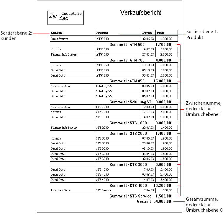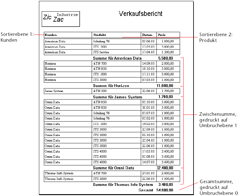 Diese Datensätze sind nach Kunden und Produkt sortiert. Nachdem die Datensätze jedes Kunden gedruckt sind, wird die Zwischensumme für jeden Kunden berechnet und gedruckt. Nachdem die Datensätze des gesamten Berichtes gedruckt sind, wird die Gesamtsumme berechnet und gedruckt.