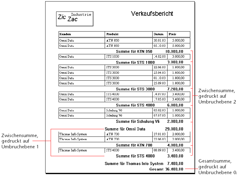 Die Berechnungen der Zwischensumme werden nur für die Gruppe von Datensätzen durchgeführt, die vor dem Umbruch stehen. Eine Zwischensumme wird z.B. für jedes Produkt berechnet, welches an diesen Kunden verkauft wurde. Die Zwischensumme für den Kunden wird für alle Produkte berechnet, die an diesen Kunden verkauft wurden.