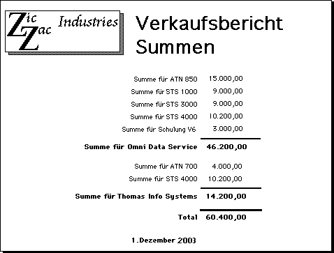 4D kann automatisch Gesamt- und Zwischensummen berechnen und drucken. TDie folgende Abbildung zeigt einen Bericht mit berechneten Zwischensummen pro Kunde und einer Gesamtsumme am Berichtende: