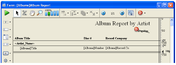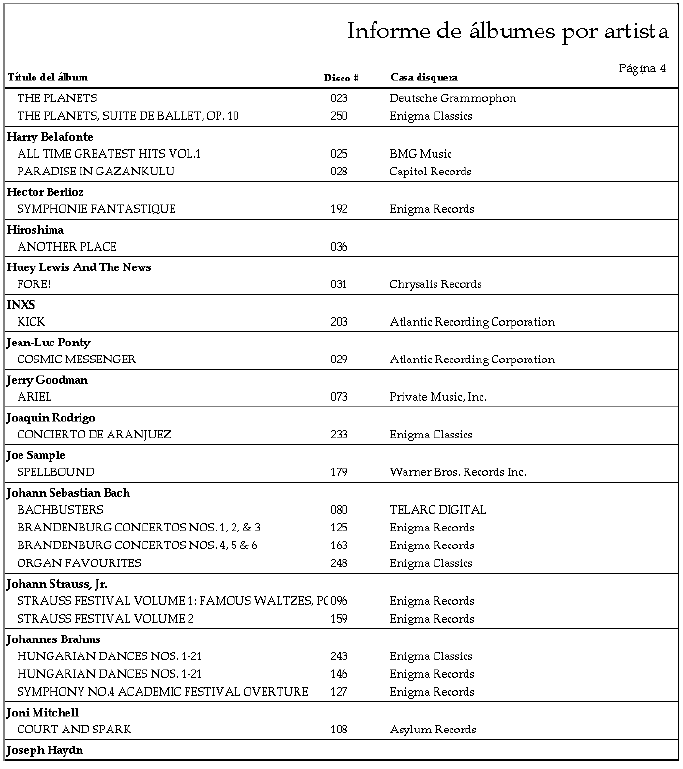 Imagine que quiere imprimir un informe de su colección de discos, clasificados por artistas. Probablemente usted tiene varios discos del mismo artista. Al ordenar los registros por artista, obtiene varios grupos de registros diferentes. La “Ruptura” ocurre después de que se imprime el último registro de cada grupo. Así se ve el informe al ser previsualizado en pantalla: