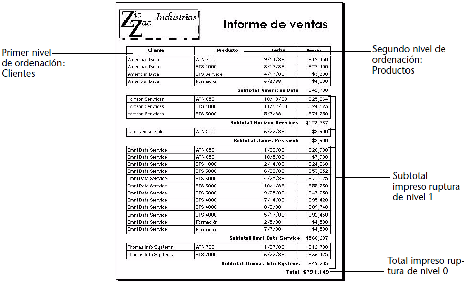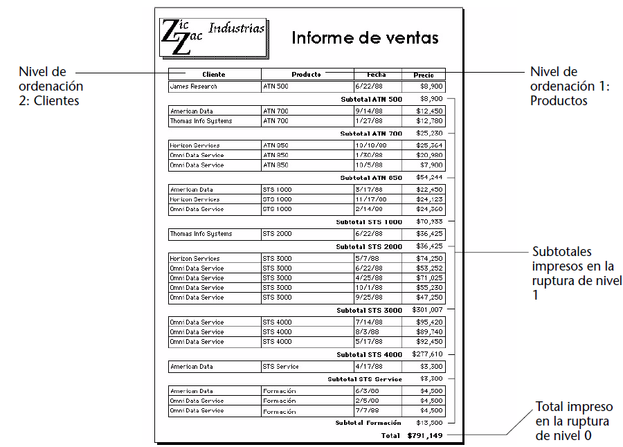 Estos registros han sido ordenados por cliente y por producto. Después de que los registros de cada cliente se han impreso, se calcula e imprime el subtotal para el cliente. Después de que se han impreso los registros para todo el informe, se calcula e imprime el total.