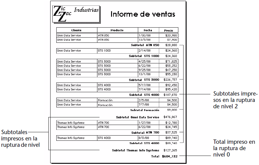 La siguiente imagen muestra los registros de ventas por cliente, producto y vendedor. Los cálculos resumen muestran dos conjuntos de subtotales: un subtotal para cada cliente y dentro de cada cliente, subtotales por cada producto. Por último, este informe calcula un total para toda la empresa. Estos son ejemplos de cálculos realizados en niveles de ruptura 2, 1 y 0.