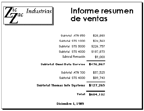 Como las listas que diseña para mostrar registros en pantalla, una lista impresa presenta columnas de información, que pueden incluir títulos de columnas sobre cada columna y pueden utilizar elementos gráficos para mejorar o hacer más claro el informe. El área de ruptura, que se imprime una sola vez al final del informe, se