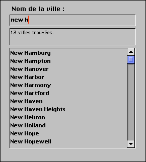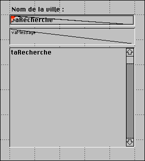 Il est composé des objets suivants : une zone saisissable vaRecherche, une zone non-saisissable vaMessage et une zone de défilement taRecherche. Lorsque l'utilisateur saisit des caractères dans vaRecherche, la méthode objet effectue une recherche sur la table [Codes postaux] permettant d'afficher des villes américaines en saisissant seulement les premiers caractères de leur nom. Voici la méthode objet de vaRecherche :