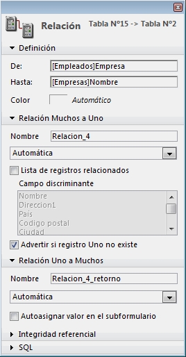 Las propiedades de la relación que une el campo [Empleados]Empresa con el campo[Empresas]Nombre son las siguientes: