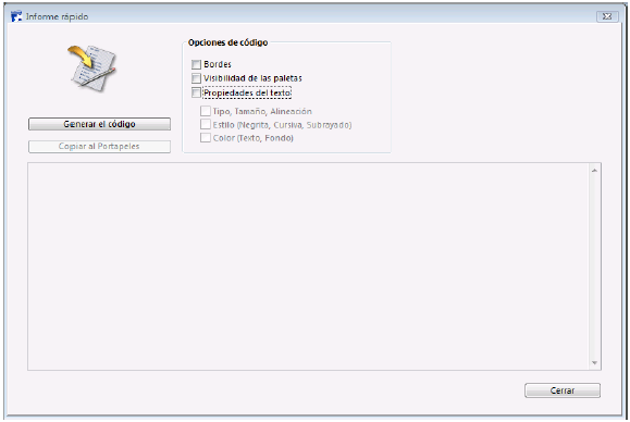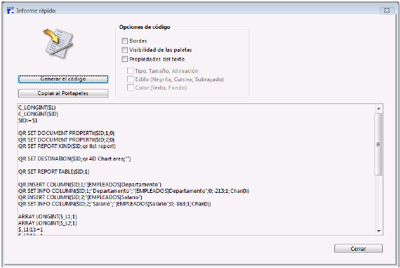 El editor de informes rápidos le permite generar automáticamente el código 4D correspondiente a un informe definido y pegarlo en el portapapeles. Esta función permite construir manualmente los esbozos de los informes rápidos que se podrán personalizar utilizando el lenguaje de 4D (comandos del tema Informes rápidos). Esta funcionalidad sólo esta disponible en modo Diseño.