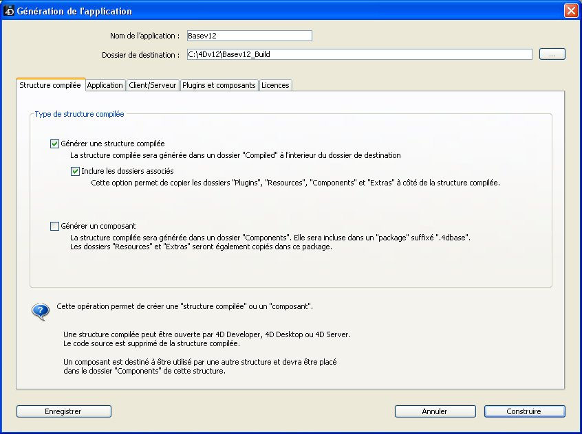 Au moment de la génération, 4D créera automatiquement un ou plusieurs dossiers (libellés “Compiled Database”, “Components”, “Final Application”, “Client Application” ou “Server Application” suivant le type de génération demandé) à l’emplacement défini. Ce fonctionnement permet d’éviter tout risque d’écrasement accidentel de fichiers du même nom et permet d’effectuer simultanément plusieurs types de générations.