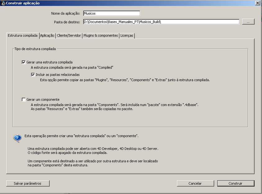 A área Nome do aplicativo contém, por padrão, o nome do arquivo de estrutura do banco. Este nome será utilizado pelos arquivos gerados (banco de dados compilado, aplicativo executável e aplicativo cliente-servidor). 4D adicionará automaticamente os sufixos necessários (.4dc, .exe, server...) de acordo com o tipo de aplicativo gerado.