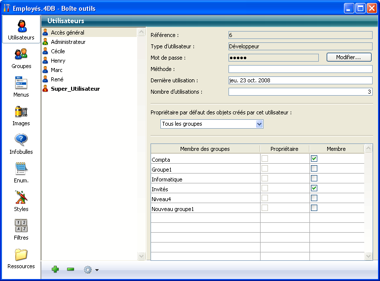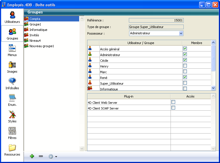 4D permet à l’Administrateur de sauvegarder et de charger tout groupe qu’il a créé ou modifié. Lorsque les groupes sont sauvegardés, tout ce qui concerne les utilisateurs et les groupes courants sont sauvegardés.