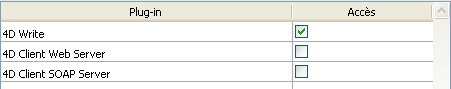 Les lignes 4D Client Web Server et 4D Client SOAP Server permettent contrôler la possibilité de publication Web et SOAP (Web Services) de chaque 4D en mode distant. En effet, ces licences sont considérées par 4D Server comme des licences de plug-ins. Ainsi, comme pour un plug-in, vous pouvez restreindre le droit d’utiliser ces licences à un groupe d’utilisateurs spécifique.