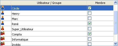 Pour placer un utilisateur ou un groupe dans un groupe, il suffit de sélectionner le groupe dans la liste puis de cocher l’option "Membre" pour chaque utilisateur ou groupe dans la zone d’attribution des membres :