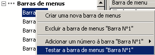 Para fazer isto, é suficiente selecionar a barra de menus escolher o comando Testar a barra de menus “Barra #X” no menu contextual ou no menu de opções do editor.