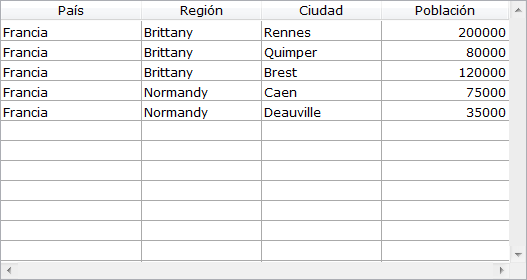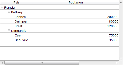 Una línea de ruptura y un "nodo" jerárquico se agregan automáticamente al list box cuando los valores se repiten en los arrays. Por ejemplo, imagine un list box que contiene cuatro arrays especificando las ciudades, cada ciudad caracterizada por un país, una región, un nombre y un número de habitantes: