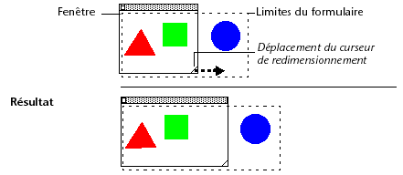Les bords droits et bas des fenêtres sont par défaut des séparateurs “pousseurs”. Cela signifie que les objets se trouvant à droite ou au-dessous des limites d’une fenêtre affichée à l’écran seront automatiquement repoussés vers la droite ou vers le bas en cas d’agrandissement de la fenêtre :