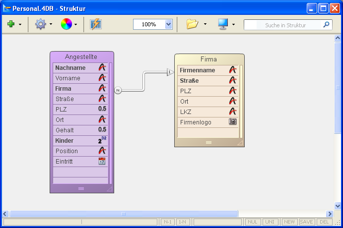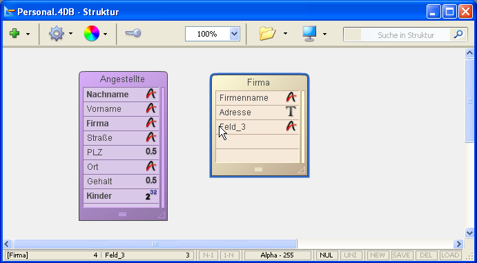 Die folgende Abbildung zeigt eine Verknüpfung zwischen der Tabelle [Angestellte] und der Tabelle [Firma] im Struktureditor: