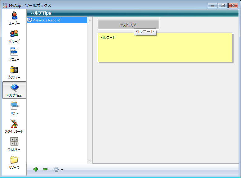- 左のリストには作成済みヘルプTipの名前がリストされます。このリストにはデフォルトフォームやフォームウィザードを使用してフォームを作成したときに自動で生成されるヘルプTipも含まれています。