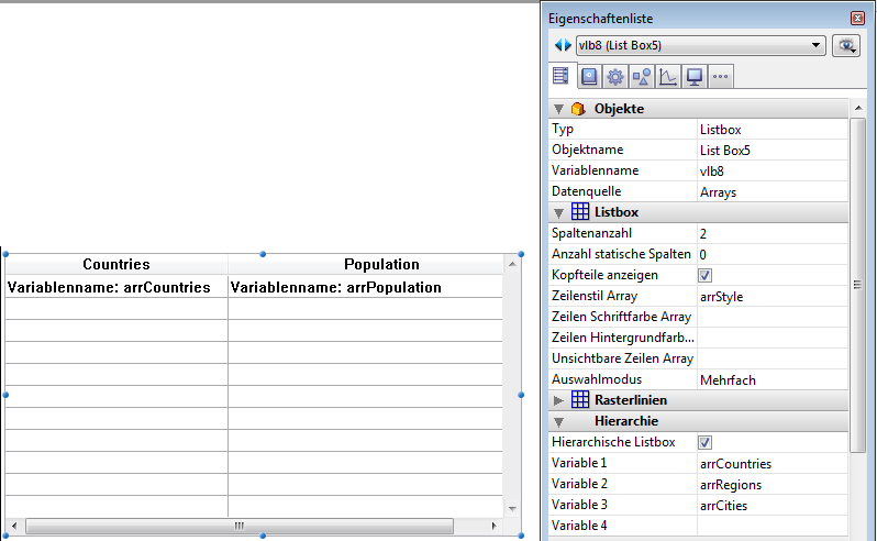 • In der Eigenschaftenliste ist die Option "Hierarchische Listbox" ist für das Objekt markiert.